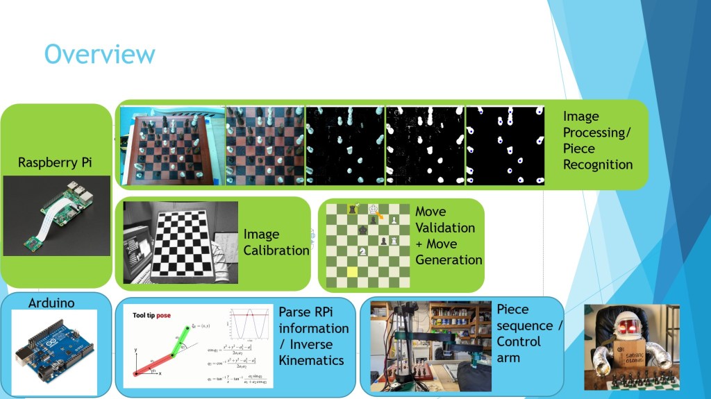 There are many different steps that are taken before a move is successful completed. There is a camera that “sees” the board, transforms it, performs HSV filtering, and more to find pieces. Then it calculates a move, gives it to the arduino, and a move is completed.