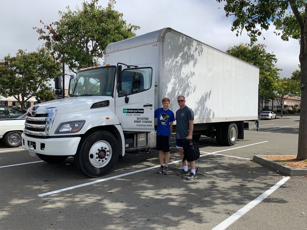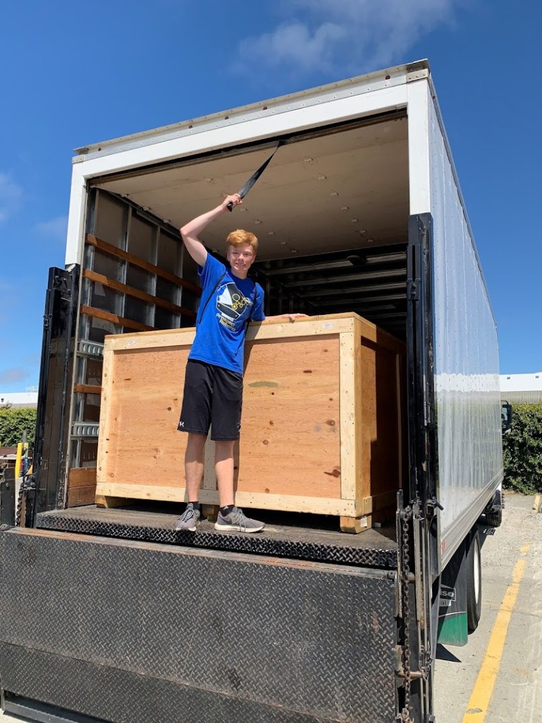In order to pick up the CNC we got to rent a 20′ box truck with a liftgate! It was a fun process to get the >500lbs CNC in the crate from the shipping center to our lab without a forklift. There was also a fun set of stairs that we had to lift the CNC up to get it into its final resting place in the lab