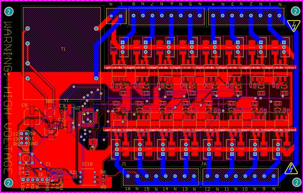 After a successful first show last year, I decided to take it to the next level and design my own PCB! There are 16 individually addressable channels to dim with easy expansion for more. Everything is controlled using an Atmega238p connected to a Raspberry Pi Zero W. There is only 1 power input for 120 AC, so there is a series of transformers and IC’s to bring that to a stable 5V for signal. Each TRIAC is opti isolated to confirm that high power is always separate from logic level power.
