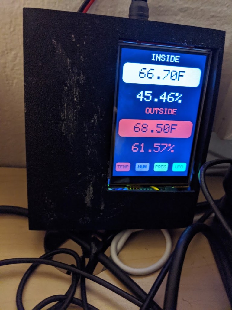 This was my first major project using Arduinos. I connected 5x WeMos D1 Mini Pros as temperature/humidity/barometric pressure sensor nodes around the house and outside. The nodes would send updates over MQTT to a server running on a raspberry pi. The hub would then display information onto a touch LCD display that could be interacted with to show specific sensor updates from each unique node. For a “fun” feature, the arduino would email what to wear when biking if it was cold so that you wouldn’t even have to think about that! The outdoor units were equipped with a solar panel that went to a BMS and an 18650 battery. This was so that I wouldn’t have to find anywhere to plug the units in and they could act independently.